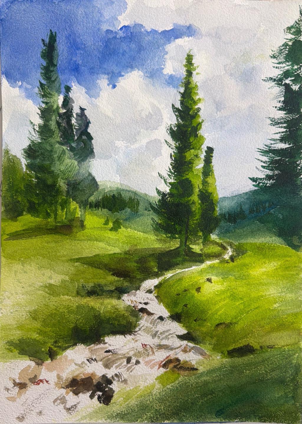 艺术的表达,离不开技法的支撑。展览中的每一幅作品,都是课堂所学技法的灵活运用与创意融合。学子们娴熟驾驭让色彩在纸面自然晕染,尽显水彩独有的通透质感;又以不透明画法塑造立体层次,让物象轮廓分明、肌理饱满。干画法的笔触利落,勾勒出丛林的苍劲、渔船的硬朗;湿画法的晕染柔和,晕染出云雾的缥缈、溪水的灵动;平铺技法营造出开阔的背景意境,留白手法则为画面预留出想象的余地,透明与不透明交织,干与湿碰撞,平涂与留白呼应,多种技法的综合运用,既展现了对课堂知识的扎实掌握,更彰显了年轻创作者们不拘一格的艺术巧思。