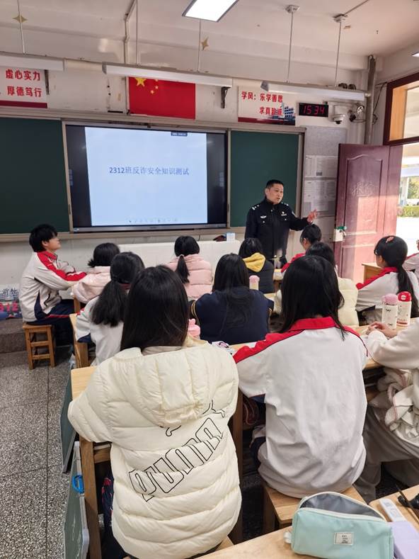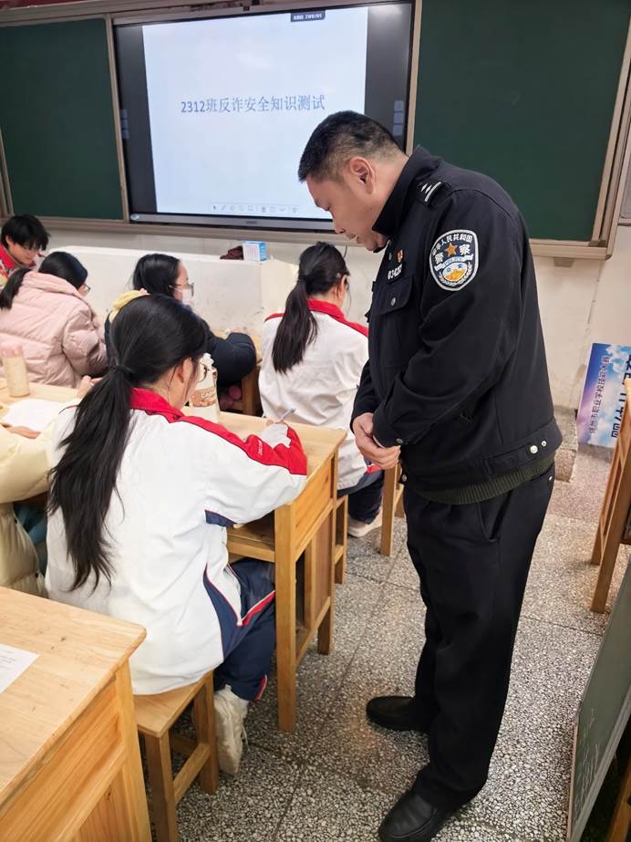 测试开始前,杨科长走进教室,为同学们开展了一场生动详实的防诈骗宣传讲解。杨科长结合近期高发的校园诈骗案例,深入浅出地剖析了电信网络诈骗、刷单返利诈骗、冒充客服退款诈骗等常见诈骗手段的特点和危害,重点讲解了识别诈骗、防范诈骗的实用技巧。他反复叮嘱同学们,要时刻保持清醒头脑,提高警惕性,不轻易相信陌生来电和信息,不随意透露个人身份信息、银行卡密码等重要内容,遇到可疑情况及时向学校、家长或公安机关求助,坚决守好自己的“钱袋子”。