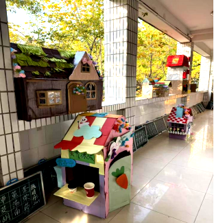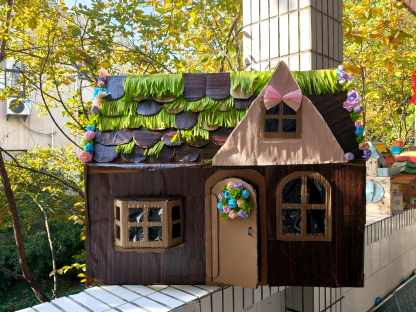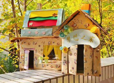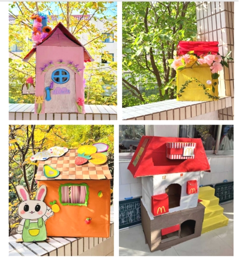 当一个个纸箱在学生们手中被裁剪、拼接,面对不同的主题和多样的装饰材料,他们仿佛踏上了一场场充满奇幻色彩的创意之旅。有的学生钟情于圣诞主题,用纸箱搭建出洋溢着“冰雪”氛围的小屋,再搭配上憨态可掬的雪人、郁郁葱葱的圣诞树等元素,将冬日的温馨瞬间定格;有的学生偏爱自然风格,让纸箱小屋被五彩斑斓的繁花簇拥,每一朵精心制作的纸艺花,都是对自然之美的细腻诠释;还有的学生打造出童话感十足的木屋,屋顶的“绿草”与“花饰”相得益彰,让童趣在创意的土壤中肆意生长。