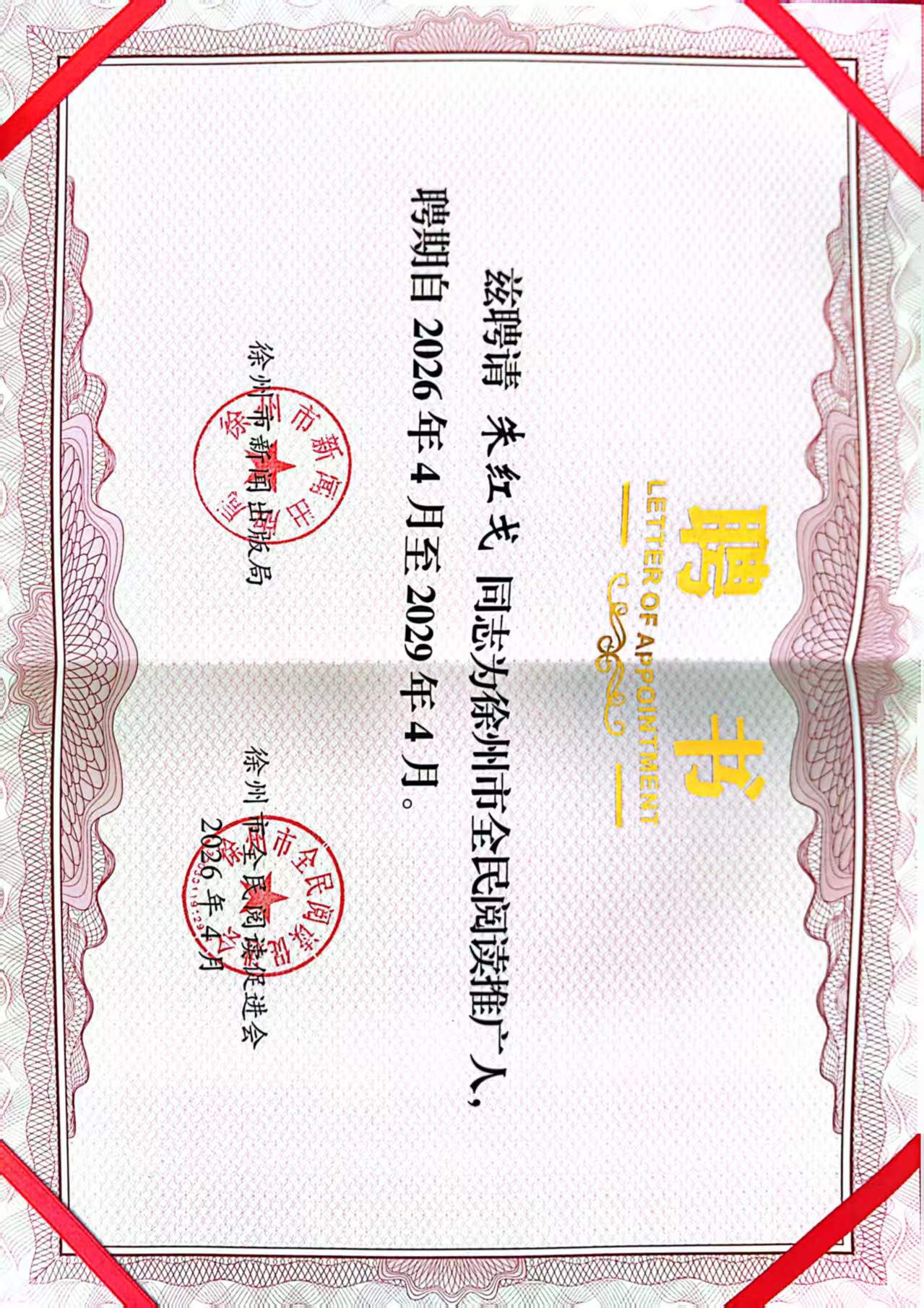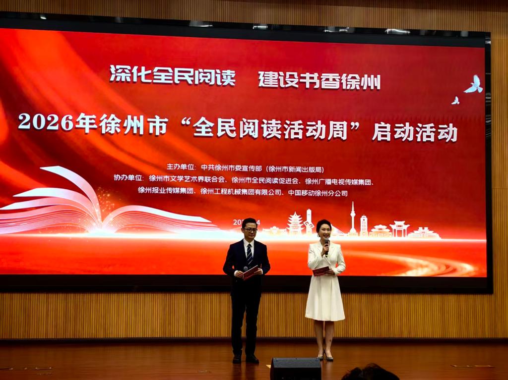 为扎实推进书香徐州建设,迎接全国首个“全民阅读活动周”,4月21日,2026年徐州市 “全民阅读活动周” 启动活动在徐州市行政中心会议中心举办,市委常委、宣传部部长刘伟,副市长丁广州出席活动。我校朱红戈老师在启动仪式上获聘市级全民阅读推广人,聘期3年,以专业力量助力 “书香徐州” 建设。