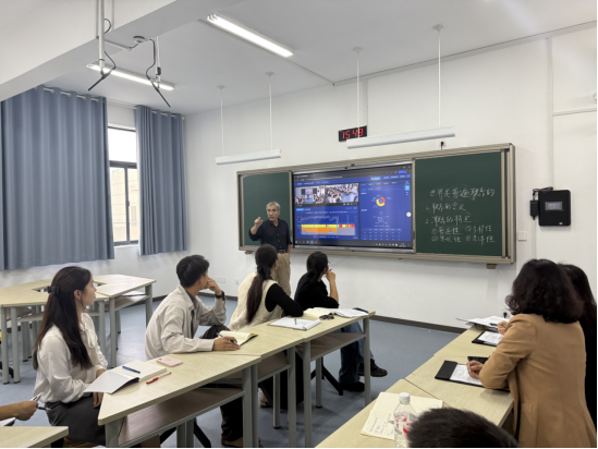 9月26日下午,亮相课最后一节《世界是普遍联系的》开课,徐州市电教馆馆长周岩莅临现场听课指导。课后,周岩馆长与新教师、教研室、系部主任展开深度研讨,既肯定了课程设计的创新性与实用性,也针对教学细节提出优化建议,并围绕“智能研修平台的高效应用”展开专项示范讲解,从平台功能操作技巧到如何借助数据辅助教研,为在场全体教师答疑解惑、指点迷津。随后,周岩馆长实地考察了学校舞蹈房、音乐教室、录播教室等教学场地,详细了解学校教学设施建设与智能研修平台应用情况,对学校在教育数字化建设方面的实践给予充分认可。