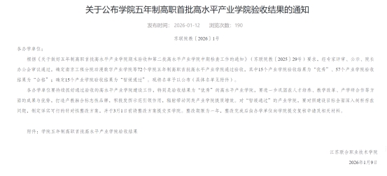 202619日,江苏联合职业技术学院五年制高职首批高水平产业学院期末验收结果公示,徐州高等师范学校智慧康育产业学院期末检验评审顺利通过,充分展现了学校产教融合、校企协同建设发展的扎实成效与鲜明特色。