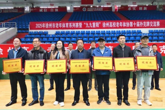 10月25日,正值第16个全国"敬老月",2025年徐州市老年体育系列赛暨"九九重阳"徐州高校老年体协第十届扑克牌交流赛在九州职业技术学院文体馆成功举办。我校退休教师陈家鸿、李素芳、禇金星、孙崇秀四位老师组成两支代表队参赛,凭借出色表现荣获团体优胜奖,其中禇金星、孙崇秀老师组合更斩获个人第三名的优异成绩。