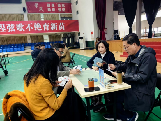 比赛现场,气氛紧张而热烈。我校四位退休教师沉着应战,默契配合,在牌桌上展现出了丰富的比赛经验和精湛的牌技。他们时而凝神思考,时而果断出牌,充分展现了师者风范和智慧光芒。经过多轮激烈角逐,最终脱颖而出,为学校赢得了荣誉。