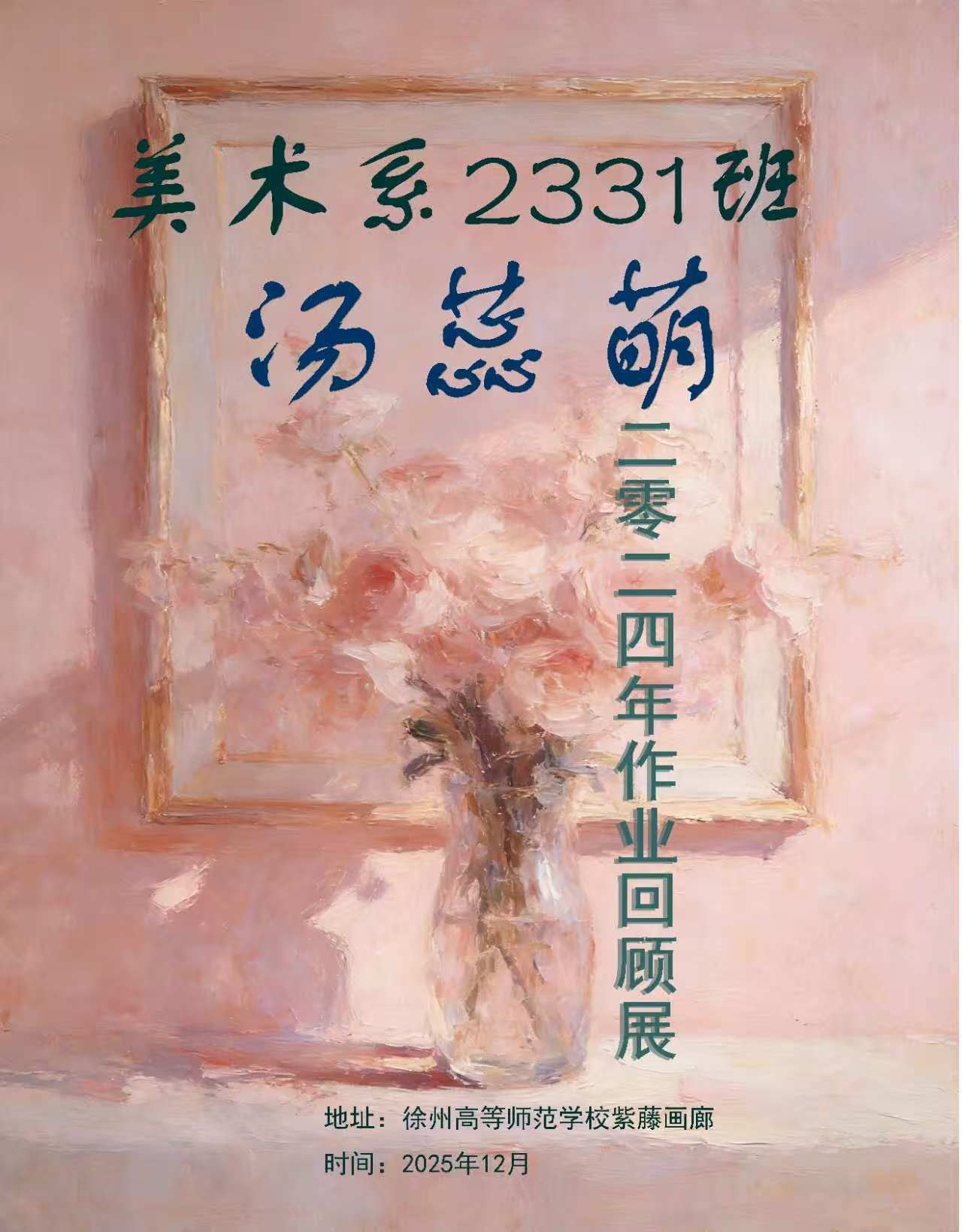 2024年12月29日至2025年1月6日,美术系2331班汤蕊萌同学的2024年作业回顾展在紫藤画廊正式展出。本次展览以“调色青春,绘见成长”为主线,集中呈现了汤蕊萌同学一年来在绘画创作上的探索足迹与艺术思考。