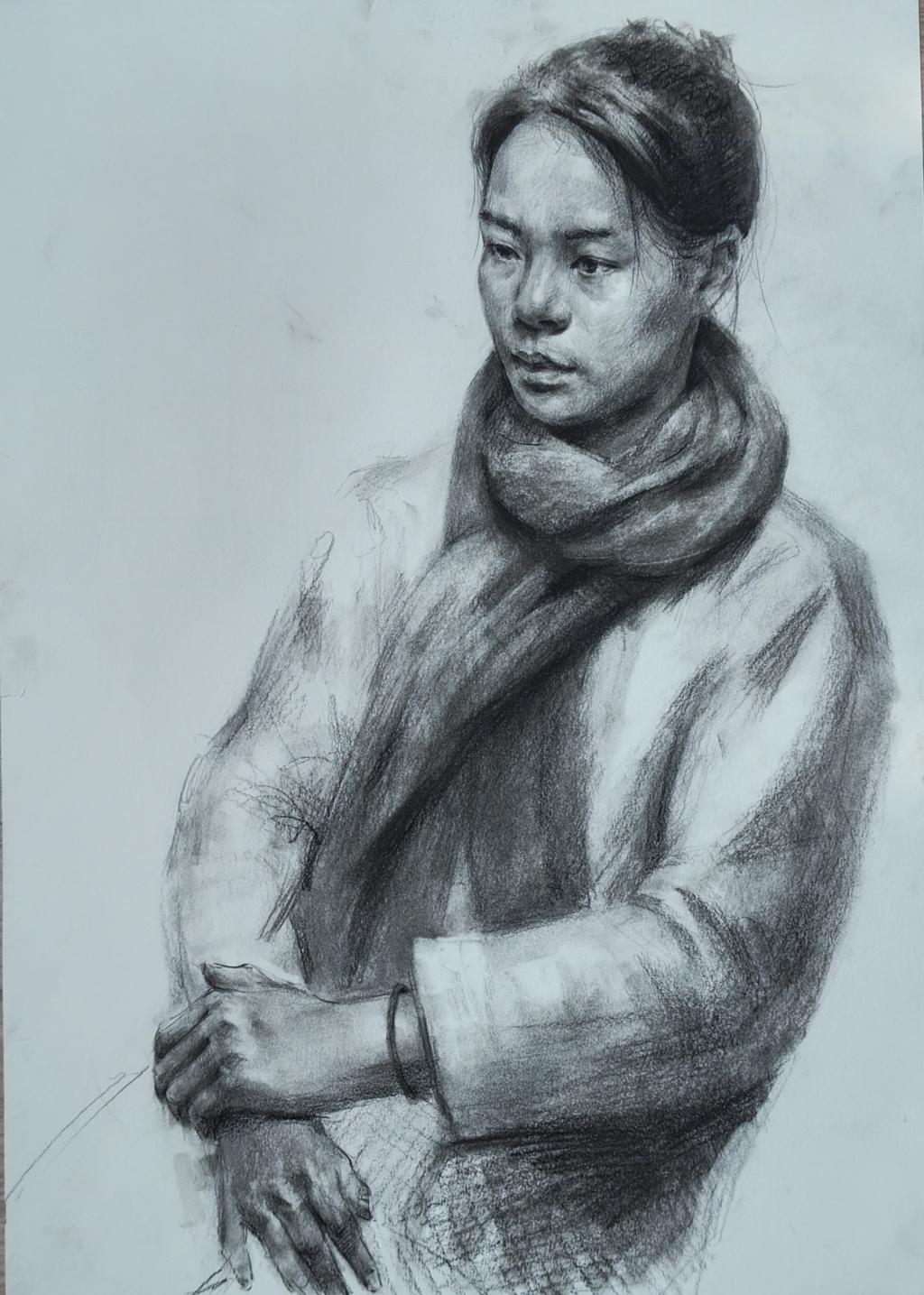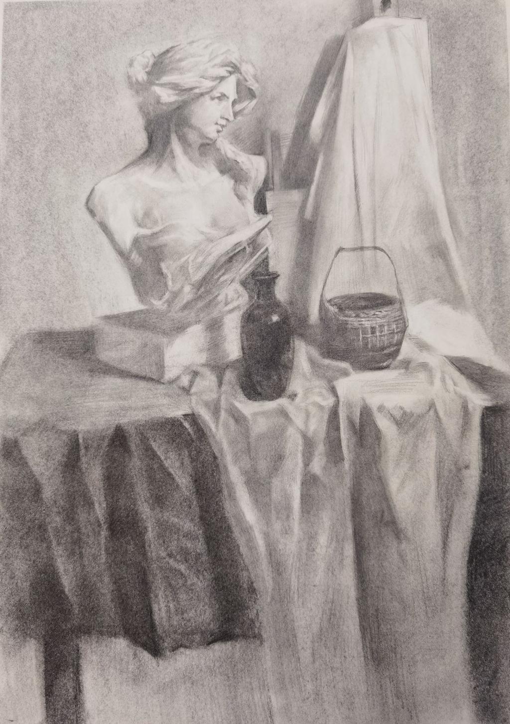 本次画展共展出潘一多同学的素描作品35幅,以人物半身像写生为主。这些作品均为潘一多同学备战省市职业学校技能大赛期间训练时,在刘海丽老师的悉心指导下集中完成的。潘一多同学凭借扎实的专业基本功与独特的艺术表现力,在2025年徐州市职业学校技能大赛中脱颖而出,一举斩获美术造型赛项一等奖。训练期间,潘一多在人物造型与素描表现技法上不断探索、大胆尝试:他熟练运用黑白灰的层次关系,精准把握画面的虚实对比与结构卡点,同时巧妙借助擦、揉等手法及点线面的结合,丰富了画面的艺术语言,让每一幅作品都兼具质感与温度。展出作品集中体现了一多同学的素描基本功和勤学苦练的学习态度。