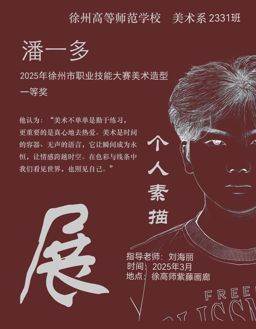 三月的徐高师校园春意盎然,紫藤缀枝,生机勃发。3月27日至31日,美术系美术教育专业2331班潘一多同学的素描作品展在紫藤画廊悄然开展,艺术之美与自然之韵在此完美交融,为春日校园增添了一抹雅致的艺术气息。